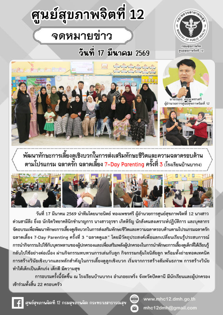จดหมายข่าวพัฒนาทักษะการเลี้ยงดูเชิงบวกในการส่งเสริมทักษะชีวิตและความฉลาดรอบด้านตามโปรแกรม ฉลาดรัก ฉลาดเลี้ยง 7-Day Parenting ครั้งที่ 3 (โรงเรียนบ้านบากง) admin / 03/17/2026