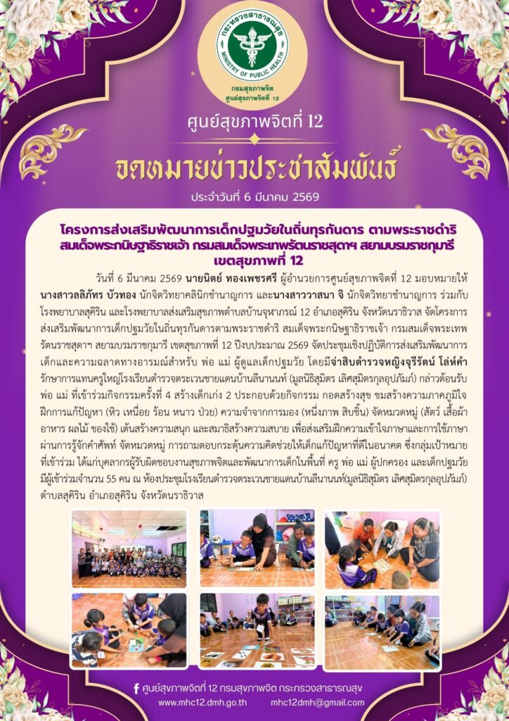 โครงการส่งเสริมพัฒนาการเด็กปฐมวัยในถิ่นทุรกันดาร ตามพระราชดำริสมเด็จพระกนิษฐาธิราชเจ้า กรมสมเด็จพระเทพรัตนราชสุดาฯ สยามบรมราชกุมารีเขตสุขภาพที่ 12 ณ โรงเรียนตำรวจตระเวนชายแดนบ้านลีนานนท์(มูลนิธิสุมิตร เลิศสุมิตรกุลอุปภัมภ์) ตำบลสุคิริน อำเภอสุคิริน จังหวัดนราธิวาส