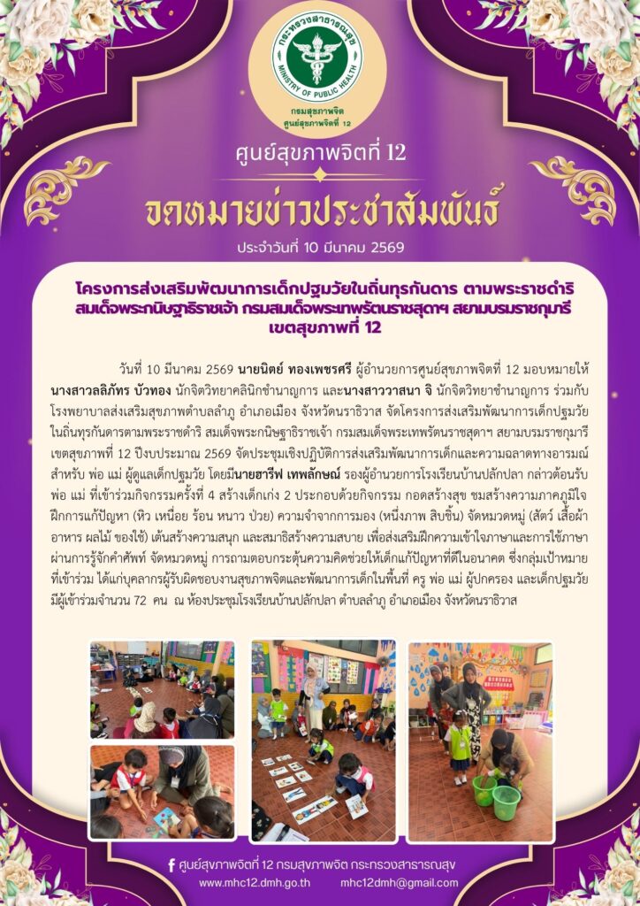 โครงการส่งเสริมพัฒนาการเด็กปฐมวัยในถิ่นทุรกันดาร ตามพระราชดำริสมเด็จพระกนิษฐาธิราชเจ้า กรมสมเด็จพระเทพรัตนราชสุดาฯ สยามบรมราชกุมารี เขตสุขภาพที่ 12 ณ โรงเรียนบ้านปลักปลา ตำบลลำภู อำเภอเมือง จังหวัดนราธิวาสBy admin / 03/10/2026