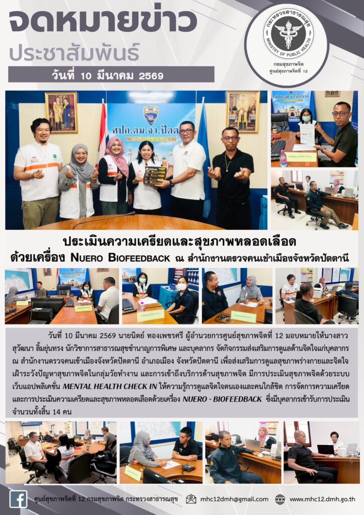 ประเมินความเครียดและสุขภาพหลอดเลือดด้วยเครื่อง NUERO BIOFEEDBACK ณ ตรวจคนเข้าเมืองจังหวัดปัตตานีBy admin / 03/10/2026